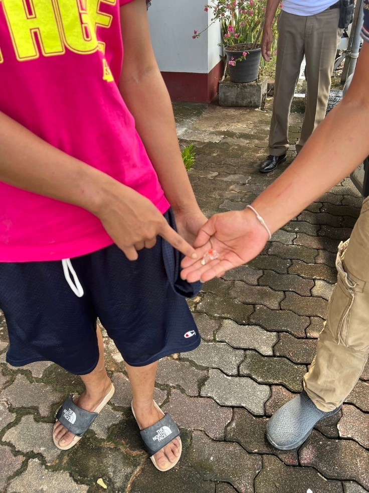 พร้อมด้วยของกลาง 1. ยาเสพติดให้โทษ ประเภท 1 ( ยาบ้า ) จำนวน 2 เม็ด ชนิดเม็ดสีส้ม โดยกล่าวหาว่า มียาเสพติดให้โทษประเภท 1 (ยาบ้า) ไว้ในครอบครองโดยผิดกฎหมาย สถานที่จับกุม หน่วยบริการโคกม่วง ม.5 ตำบลโคกชะงาย อำเภอเมืองพัทลุง จังหวัดพัทลุง |