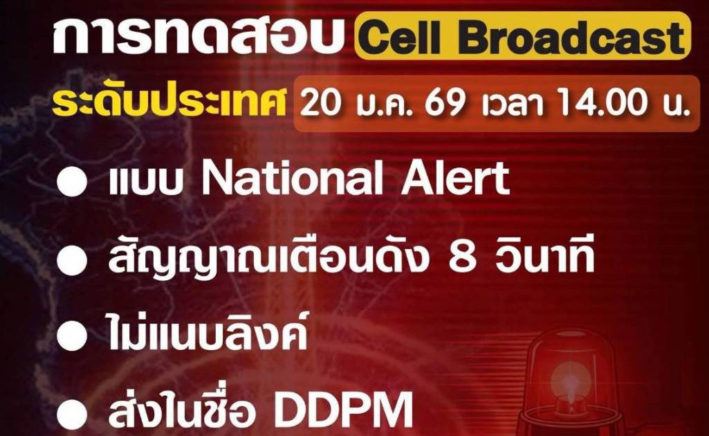 กรมป้องกันและบรรเทาสาธารณภัย (ปภ.) จะทดสอบระบบแจ้งเตือนภัยผ่าน Cell Broadcast ระดับประเทศ (Nationwide Test)