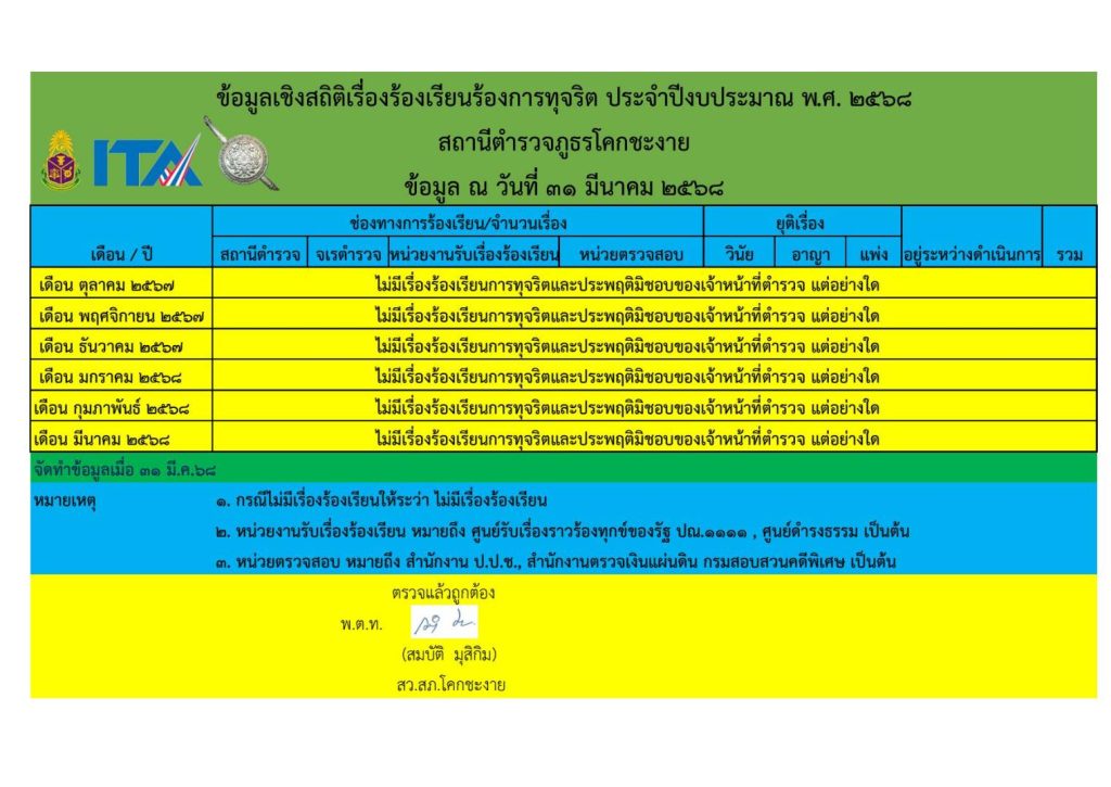 ข้อมูลเชิงสถิติเรื่องร้องเรียนการทุจริต ประจำปีงบประมาณ พ.ศ.2567